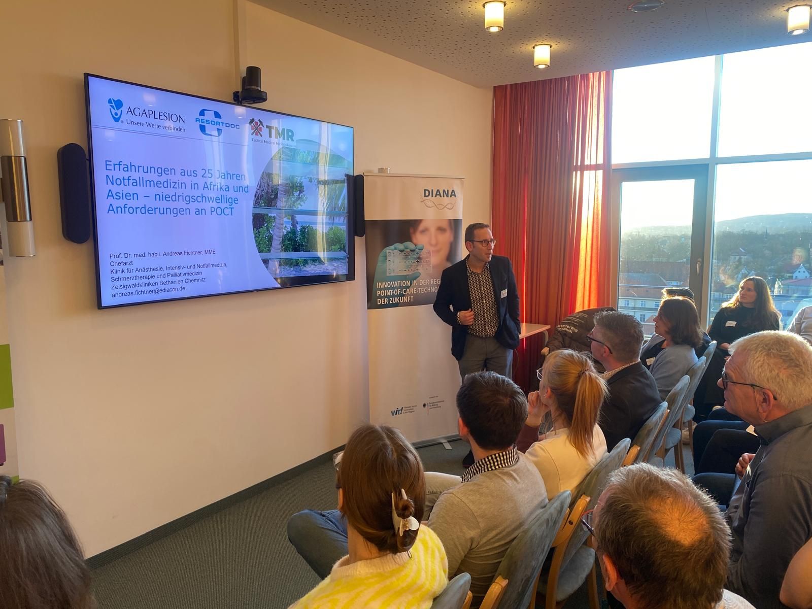Am 29. Januar 2025 fand ein interaktiver Workshop zusammen mit Ärzten und Ärztinnen und Pflegenden im Klinikum Chemnitz gGmbH statt. Zusammen mit dem Bündnis Wir! sind Diana wurden verschiedene Aspekte zu Entwicklung der Point of Care-Techniken (POCT) in der Medizin diskutiert, die dazu dienen, Diagnostik vor Ort und zeitnah in verschiedensten Bereichen zu ermöglichen. Ziel war es, neue Ideen zu diskutieren und Erfahrungen mit verschiedenen Perspektiven auszutauschen. Inputvorträge in die Entwicklung zu bringen. Einblicke in die Umsetzung solcher Techniken brachten die Inputvorträge von Prof. Andreas Fichtner (Zeisigwaldkliniken Bethanien  Chemnitz, www.bethanien-chemnitz.de) sowie aus dem Bereich der Labordiagnostik und Pflege durch Dr. rer. nat. Dirk Pohlers und Thomas Schumann (Klinikum Chemnitz gGmbH,www.klinikumchemnitz.de).